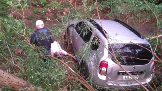Mulher tem queda de pressão e carro cai em córrego