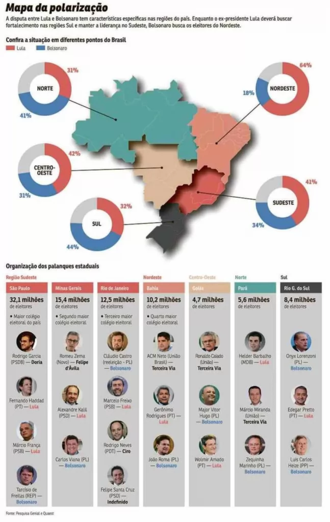 No Norte e no Centro-Oeste, Bolsonaro também vislumbra palanques amistosos, principalmente de atuais governadores que tentam reeleição, como Ronaldo Caiado (União), em Goiás, Ibaneis Rocha (MDB), no DF, e Wilson Lima (União), no Amazonas. No caso do DF, Ibaneis espera o reforço da ex-secretária de Governo de Bolsonaro Fávia Arruda (PL) como candidata ao Senado. Lula terá os palanques da esquerda, cujos pré-candidatos não despontam entre os favoritos, de acordo com as pesquisas.