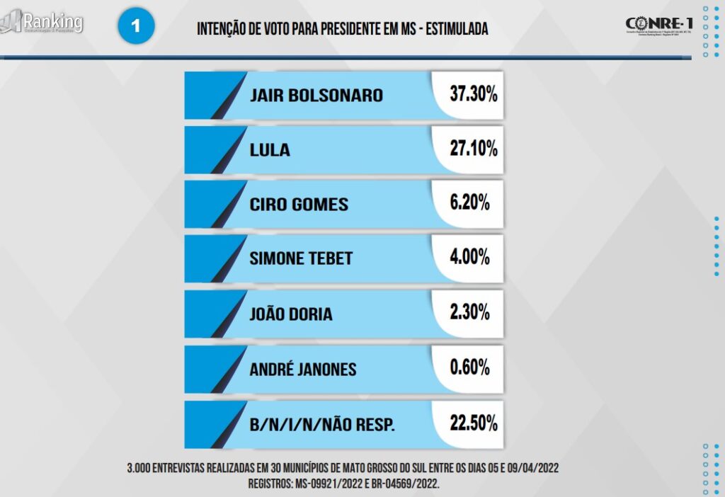 Esta é a constatação da primeira pesquisa do Instituto Ranking Brasil com 3 mil eleitores entre os dias 5 e 9 de abril deste ano, com margem de erro de 1,8% para mais ou menos e registrada com os números MS-09921/2022 e BR-04569/2022.
