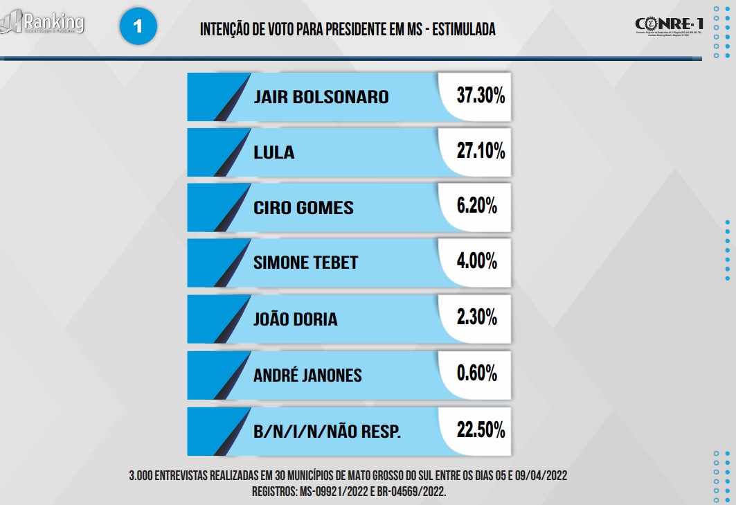 Esta é a constatação da primeira pesquisa do Instituto Ranking Brasil com 3 mil eleitores entre os dias 5 e 9 de abril deste ano, com margem de erro de 1,8% para mais ou menos e registrada com os números MS-09921/2022 e BR-04569/2022.