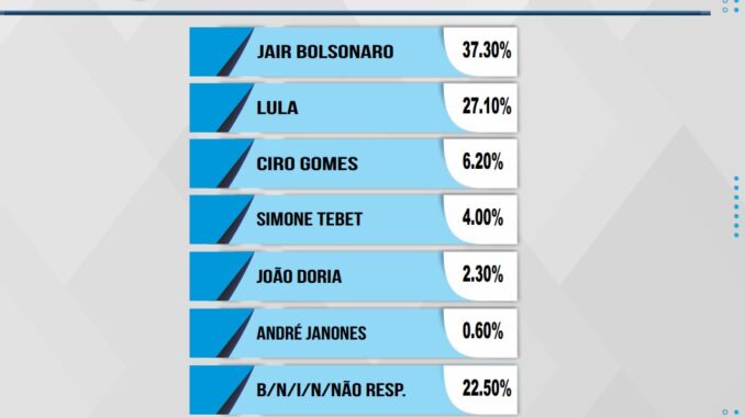 Após o aumento de até 25% nos preços dos combustíveis e desistência do ex-juiz Sergio Moro (União Brasil), as intenções de voto no presidente Jair Bolsonaro (PL) subiram em Mato Grosso do Sul. O ex-presidente Luiz Inácio Lula da Silva (PT) teve oscilação para baixo, enquanto o ex-ministro Ciro Gomes (PDT) se consolidou em terceiro lugar, enquanto Simone Tebet (MDB) ficou em 4º lugar.