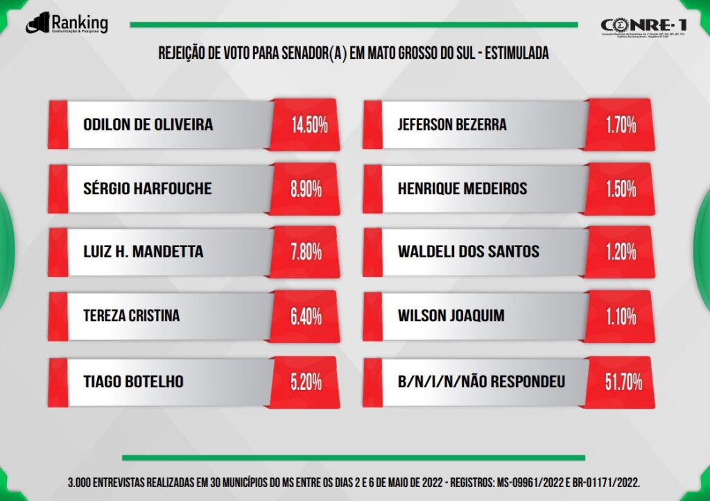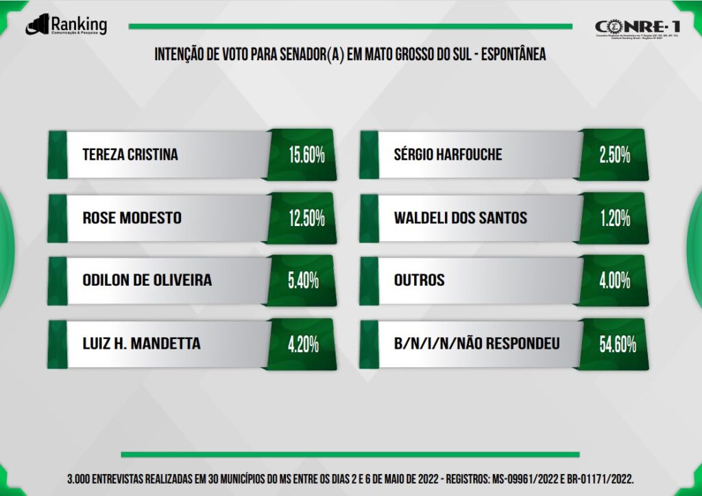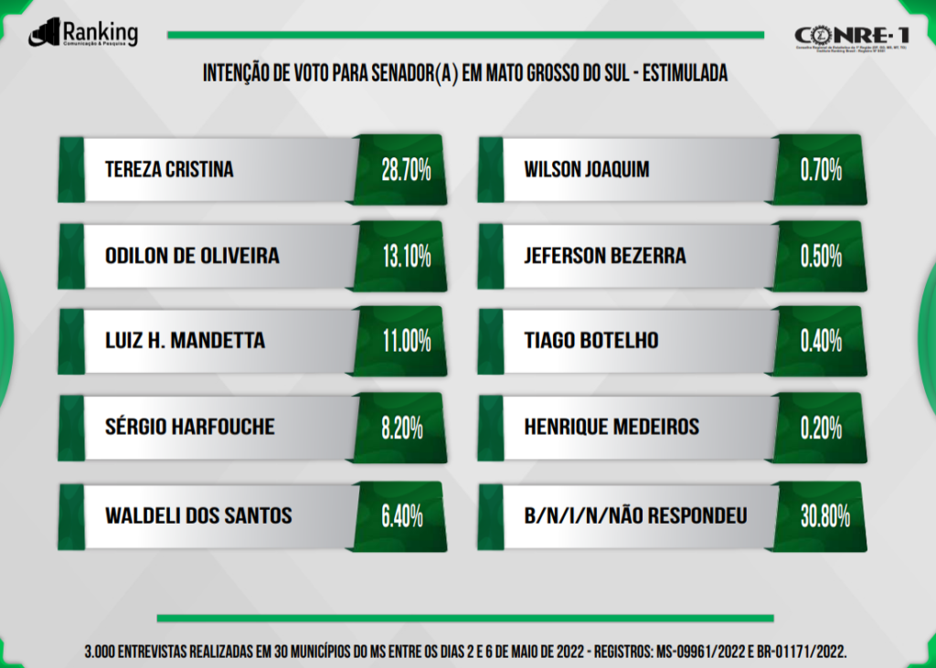 Realizado com 3 mil eleitores, o levantamento tem margem de erro de 1,8% e foi registrado na Justiça Eleitoral com os números BR-01171/2022 e MS-09961/2022. A sondagem considerou nove pré-candidatos ao Senado.