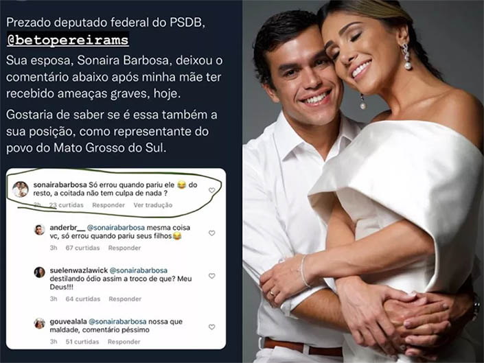 Deputado federal por Mato Grosso do Sul, Beto Pereira classificou como “infeliz e desnecessário” o comentário que a esposa, Sonia Barbosa deixou em um post do Youtuber Felipe Neto, em sua conta no Twitter, sobre ameaças de morte à mãe dele.
