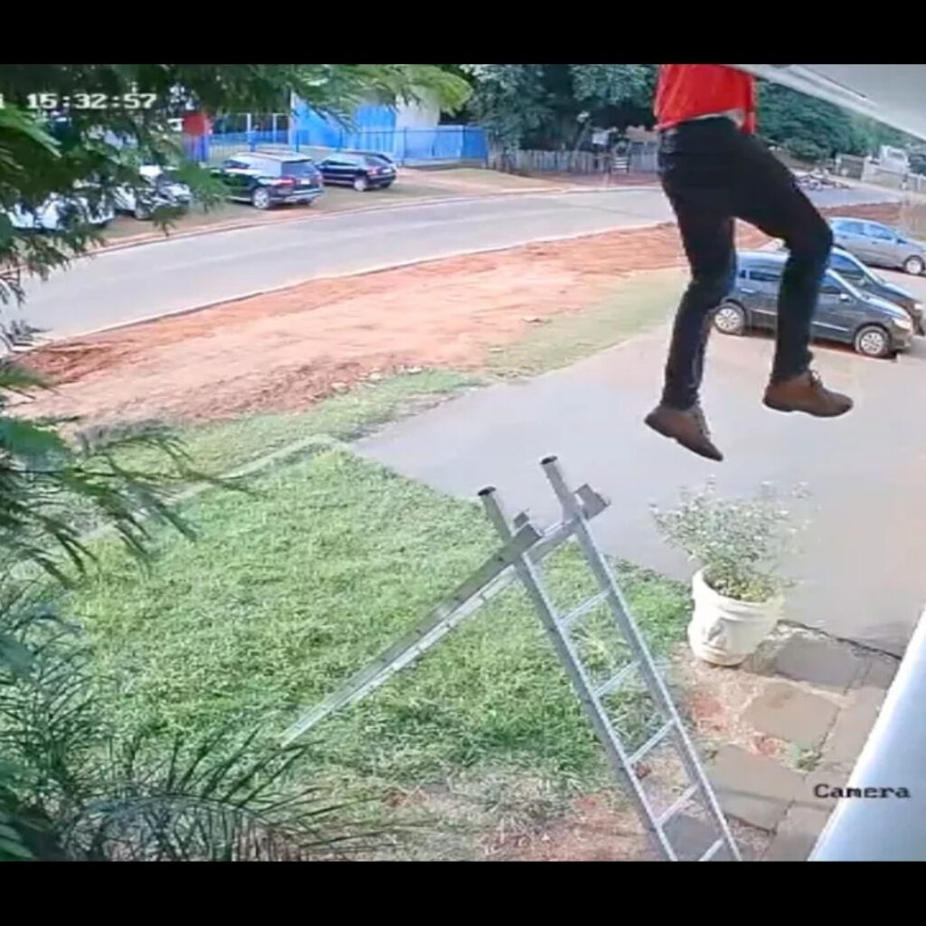 Trabalhando a alguns metros do chão, um homem ficou pendurado no telhado após a escada que usava escorregar na cidade de Ponta Porã (MS) – a 295 km de Campo Grande. Câmera de segurança flagrou quando um militar conseguiu resgatar o trabalhador que fazia reparos em uma residência.