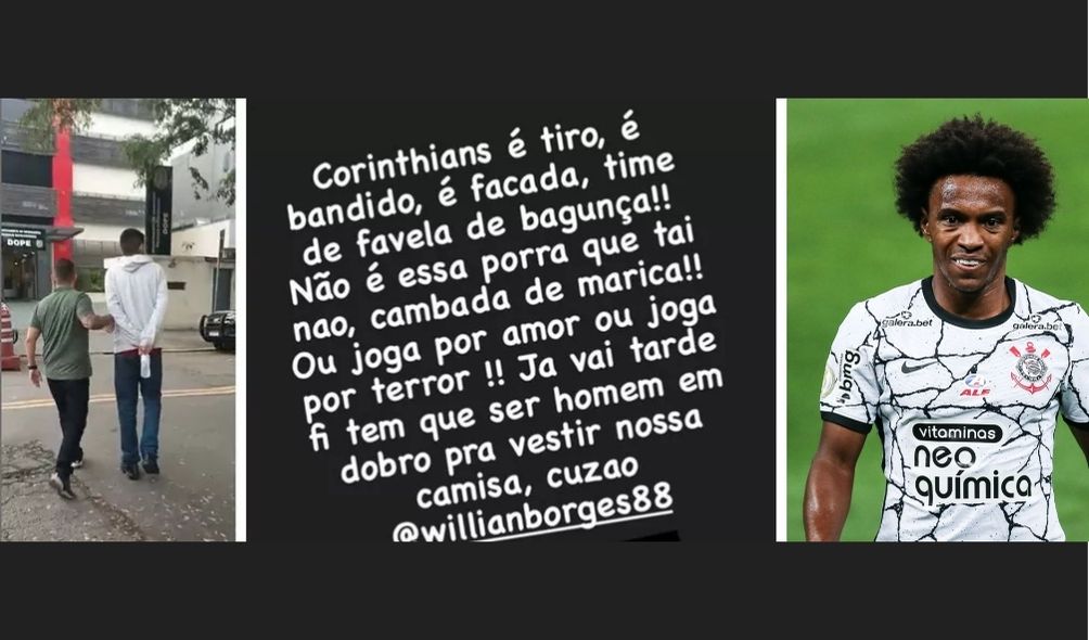 Torcedor do time foi detido nesta quinta (2) por suspeita de fazer ameaças contra o jogador de futebol e suas filhas. Willian registrou boletim de ocorrência na quarta (1º) depois de receber mensagens como: ‘Ou joga por amor ou joga por terror’.