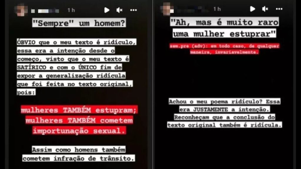 “Primeiramente, quero deixar explícito o meu repúdio ao caso de estupro que foi noticiado. Aquilo não é um ser humano, muito menos um médico. Diante do acontecido, um perfil do Instagram publicou uma imagem que continha um poema que lamentava a situação, mas que logo tomou outro rumo. Até que, enfim, o texto finalizou com “nem todo homem, mas sempre um homem”. Ora, os estupros não são sempre cometidos por homens, ainda que o sejam na maioria das vezes. A palavra “sempre” exclui exceções, e este certamente não é o caso. Diante da conclusão estapafúrdia do poema original, que imputa somente ao homem o crime de estupro, fiz um poema satírico e tão ridículo quanto a conclusão do primeiro. Nele, fiz uma sátira me referindo a infrações de trânsito e ironizei como se só as mulheres cometessem, o que é claramente não é verdade. Em nenhum momento no meu texto ironizo o estupro ocorrido, não fiz piada com estupro e muito menos fiz piada com violência. Foi apenas um texto satírico, inocente e intencionalmente absurdo a fim de expor a ideia ridícula insinuada através da frase “sempre um homem” no texto original, o que é uma conclusão ilógica, sem cabimento. Em nenhum momento comparei o crime de estupro a infrações de trânsito, isso sequer faz sentido. É óbvio que há homens que cometem infração de trânsito, assim como há, também, mulheres que estupram. E é isso que o meu texto satírico quis expor: o ridículo da conclusão do texto original”.