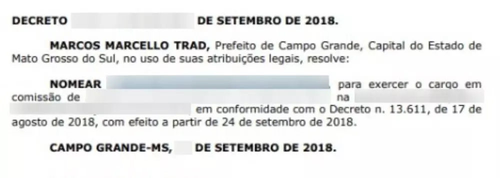 Meses depois, já em setembro de 2018, a jovem foi nomeada para um cargo comissionado, em decreto assinado por Marquinhos Trad.