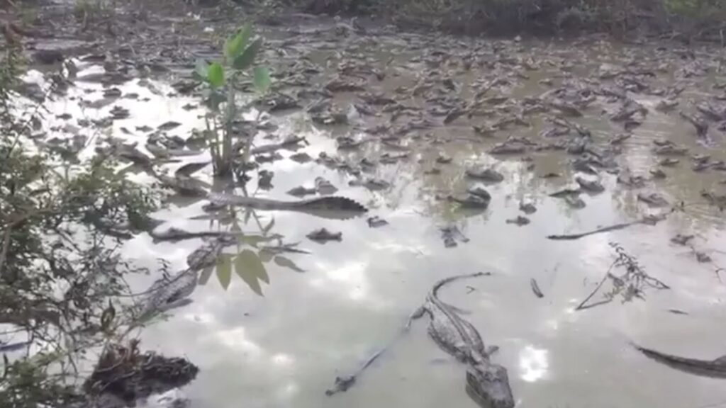 Centenas de jacarés foram vistos aglomerados em uma lagoa, à procura de água e alimento. O vídeo chocante mostra a luta que os animais estão enfrentando na região do Porto Esperança, em Corumbá, a 420 km de Campo Grande.