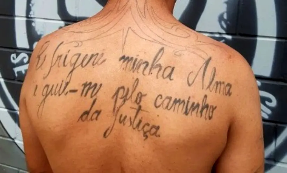 A tatuagem de um preso de Anastácio (MS) repercutiu na internet após ele ser capturado, nessa terça-feira (20). Nas costas, o homem tem tatuado: “Refrigere minha alma e guie-me pelo caminho da justiça”, trecho que faz parte de um versículo da bíblia. O homem era foragido da polícia e foi descoberto após apresentar um comportamento suspeito diante de um investigador policial.