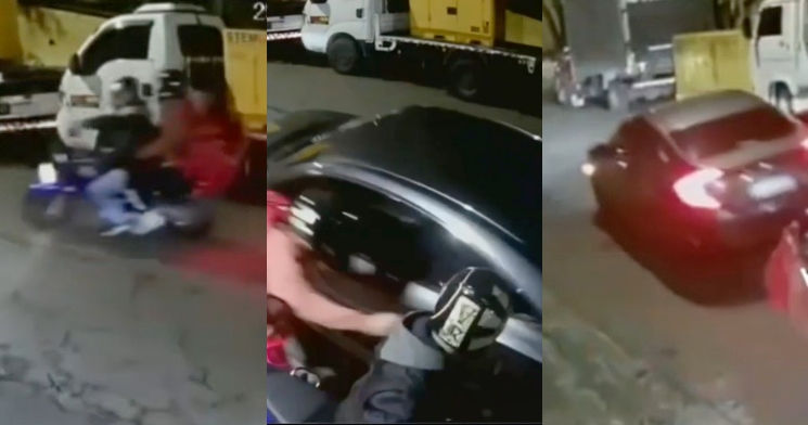 O vídeo mostra dois assaltantes chegando repentinamente em uma moto, quando um deles corre armado em direção ao carro do trabalhador, que estava estacionado próximo ao meio fio, e tentar abrir uma das portas do veículo. Neste momento, o motorista percebe o assalto acelera o carro, fazendo o assaltante ‘rodopiar no ar’.