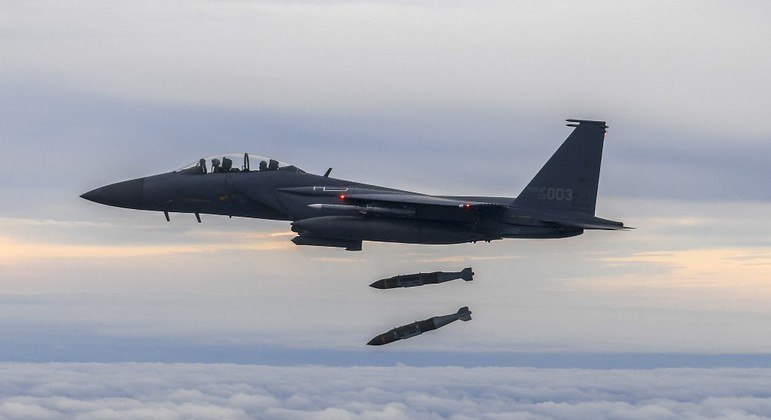 Os caças sul-coreanos “lançaram duas bombas conjuntas de ataque direto contra um alvo virtual no mar Amarelo”, informou o Estado-Maior Conjunto de Seul.