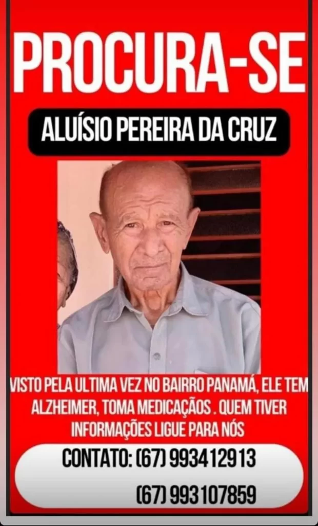 Quem tiver informações sobre o paradeiro de Aluízio pode entrar em contato com a família do idoso, através dos telefones (67) 9 9269-3294; (67) 9 9341-2913 ou (67) 9 9310-7859.