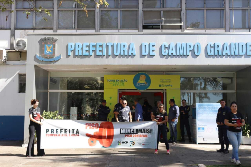 Com megafone e faixas, professores protestam por reajuste em frente à prefeitura de Campo Grande