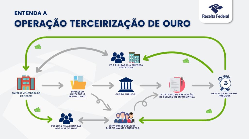 Conforme a Receita Federal, essa operação foi batizada de Terceirização de Ouro, e tem como foco desmantelar uma organização criminosa, que envolve servidores públicos investigados por desvio de recursos públicos, direcionando contratos e através de processos licitatórios fraudulentos.