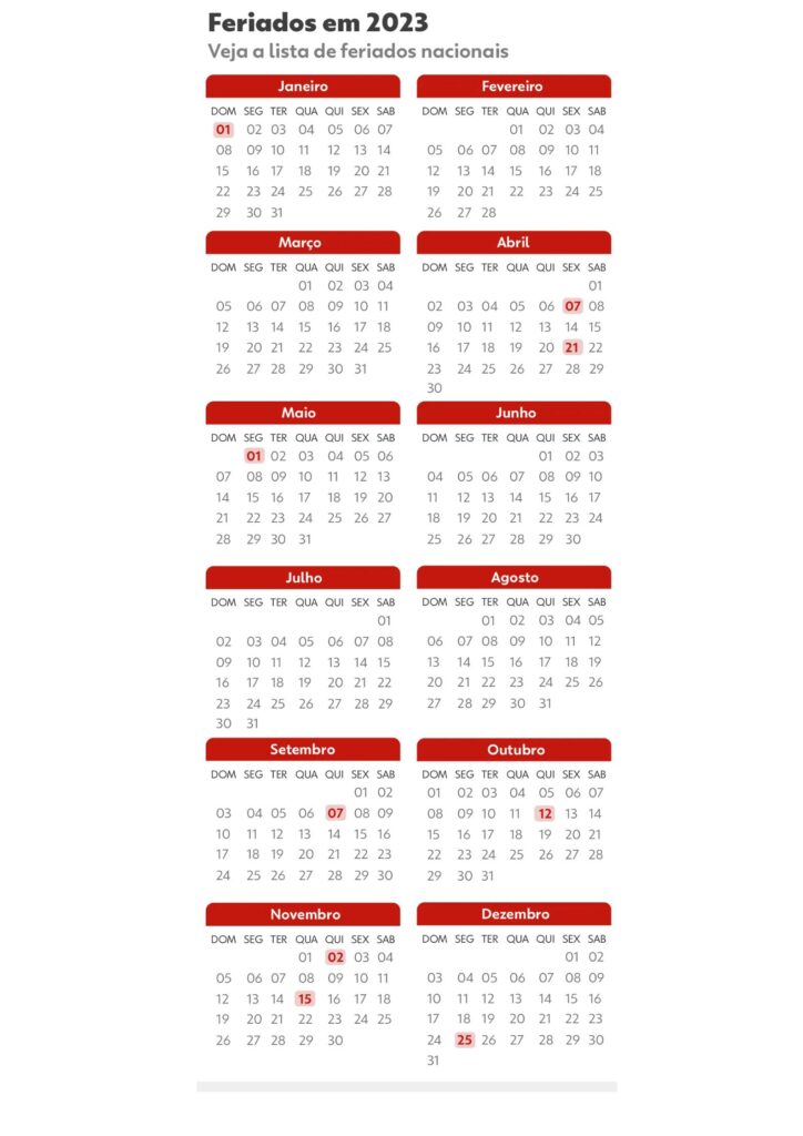 O calendário de 2023 terá 9 feriados nacionais. Destes, quatro serão prolongados, isto é, caem em segundas ou sextas-feiras e, portanto, emendam com o final de semana.