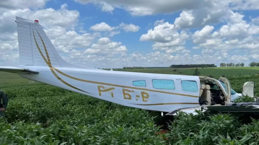 Então, foi ordenado pouso imediato, quando houve o pouso forçado na área rural de Santa Cruz do Rio Pardo. Com isso, a aeronave foi danificada, caindo com o bico na plantação de soja.