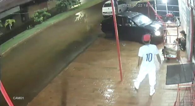 A mulher se aproximou com o veículo e prensou o homem contra a parede. Ela se afasta e acelera o carro novamente, prensando o homem novamente.