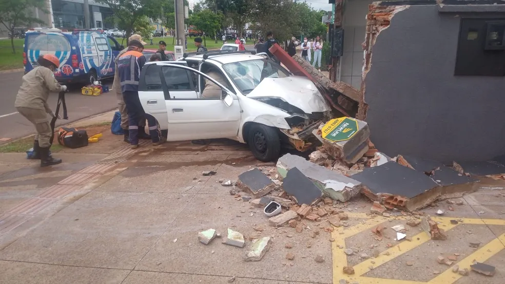 Com o impacto da colisão, a viatura capotou, o carro de passeio bateu em um veículo que estava estacionado, depois perdeu o controle da direção, invadiu o canteiro central, atravessou a pista e só parou quando atingiu e derrubou parte do muro de um dos imóveis na avenida, ao lado da loja Tok&Stok.