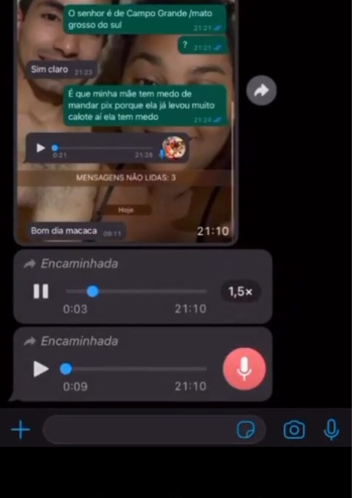 Ainda de acordo com a ocorrência, em resposta a mulher teria dito que não pagaria antecipado, por causa de golpes e que, após o serviço, entregaria o valor combinado. O suspeito então enviou o áudio informando que estava ofendido, pois nunca aplicou golpe em ninguém. Veja os áudios acima.