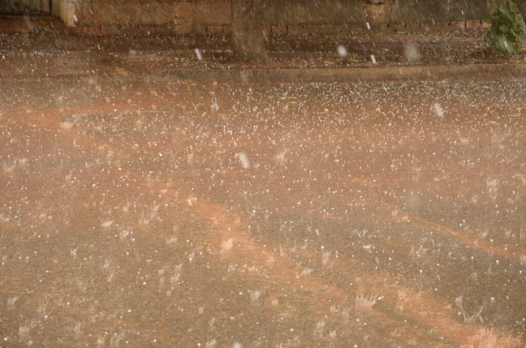 Depois de uma manhã de sol, como previsto, a chuva voltou a cair em Campo Grande no fim da manhã deste domingo (20) e ela chegou acompanhada de granizo.