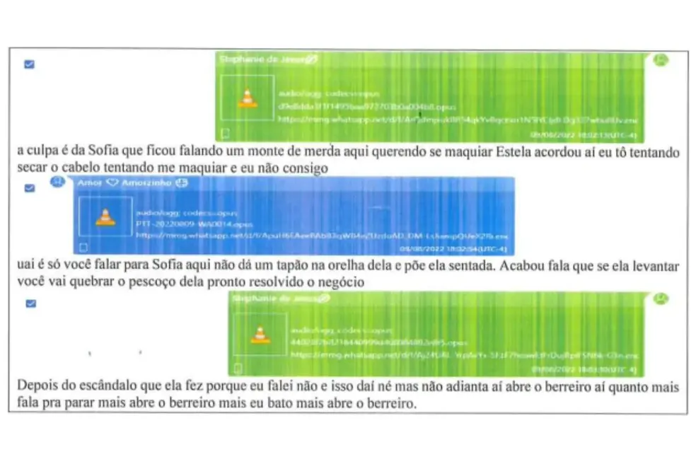 A maioria das conversar foram retiradas do telefone de Stéphanie. A primeira mensagem listada é de 2 de dezembro de 2021, quando Sophia apanha por “tirar” os brinquedos da mão do irmão.