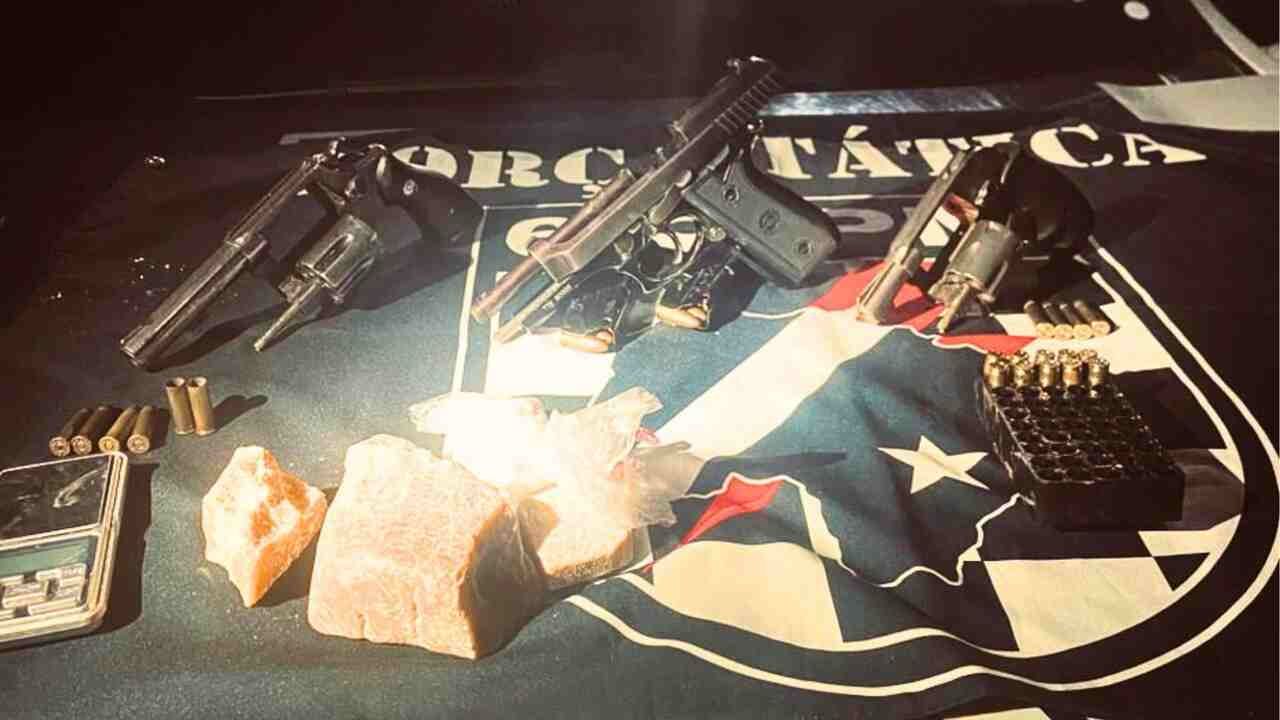 Na casa onde ele havia entrado, os policiais encontraram em cima da cama, enrolado em uma camiseta, de cor azul, duas armas, sendo uma pistola com um carregador com 15 munições 9mm mais um carregador sobressalente com 15 munições, um revólver calibre .38 SPI com cinco munições intactas, seis porções de cocaína, 10 munições 9mm em uma colmeia para munição e uma balança de precisão.