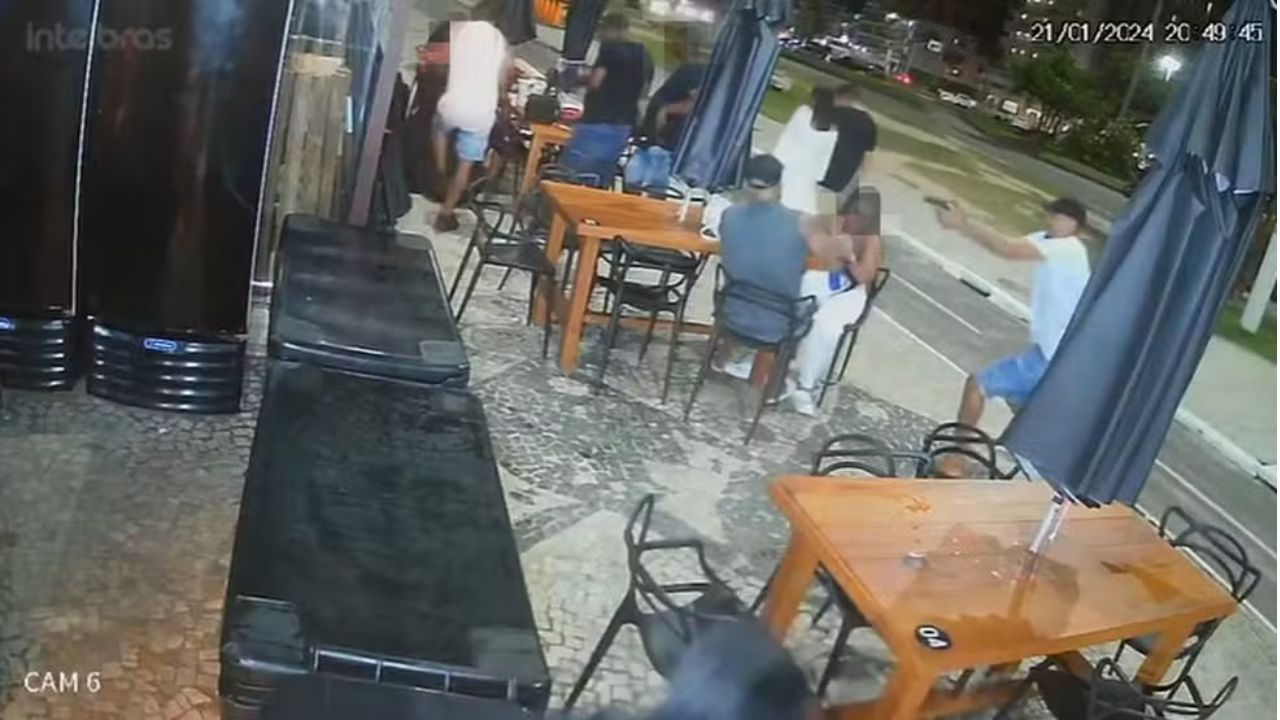 Sérgio estava com a namorada em um quiosque próximo ao Posto 12 às 20h49. Ele estava sentado com a mulher, que mostrava algo a ele no celular. Assim que ela termina de mostrar, um homem de camisa clara, bermuda jeans e boné preto se aproxima com uma pistola na mão.