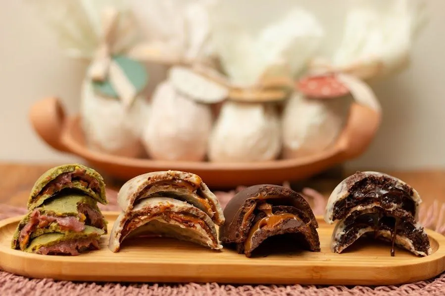 Entre os disponíveis, destacam-se os de casca recheada entre 400 a 600g nos sabores: pranilé de gianduia (R$ 288); Smore’s com casca de chocolate recheada de brigadeiro,cookies e marshmallow (R$ 288); pistache tradicional (R$ 368); pistache branco com casca de chocolate branco (R$ 368); e pão de mel com doce de leite (R$ 288).