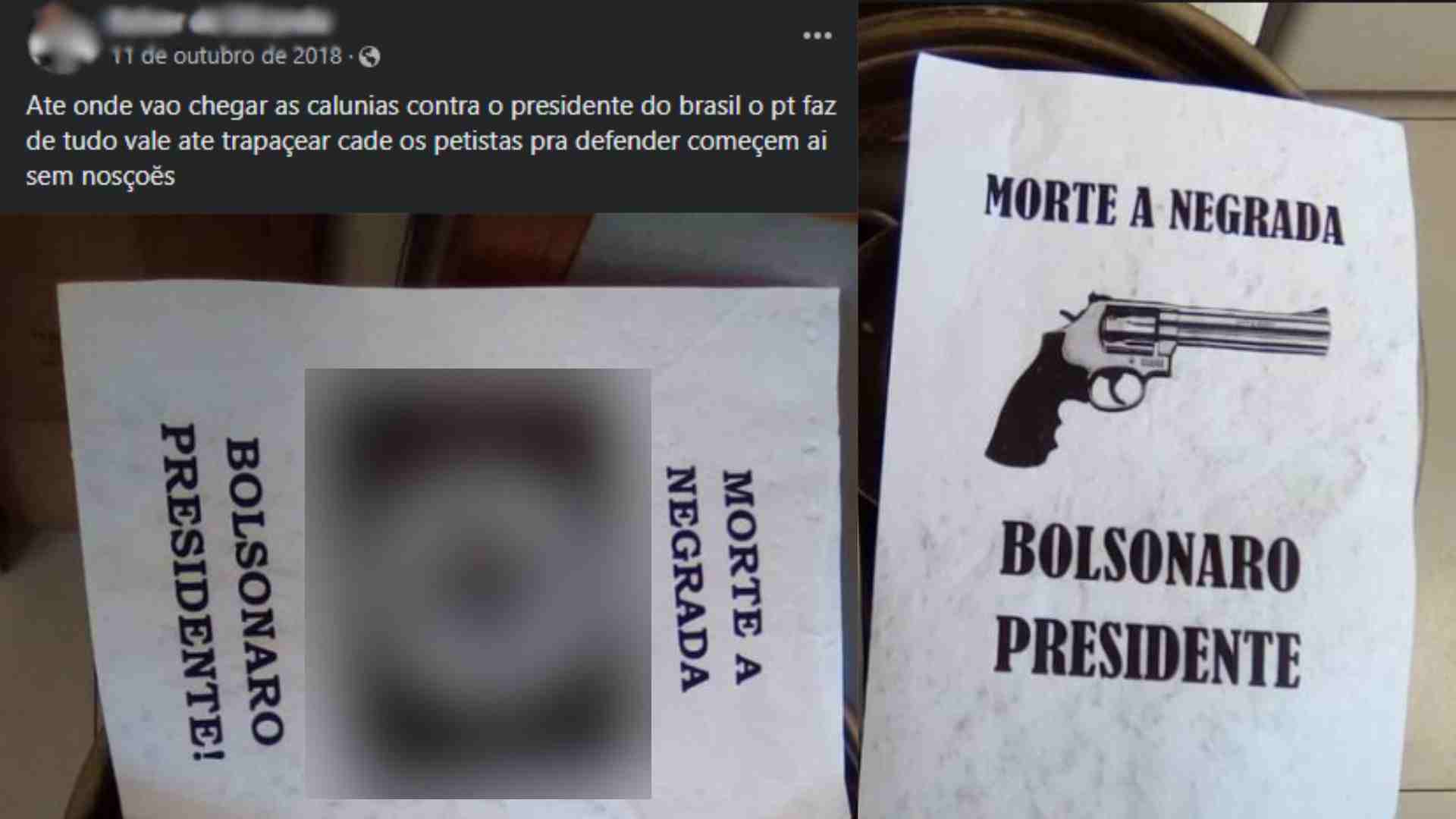 Em uma delas, postada no dia 11 de outubro, época de eleições presidenciais, além de legenda contra o Partido dos Trabalhadores (PT), uma foto com duas impressões também foi compartilhada. Nos papéis, um deles com símbolo nazista e o outro com um desenho de uma arma de fogo, existe a frase ‘Morte a negrada’.