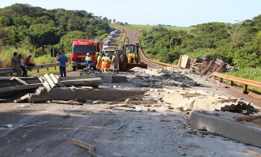A carreta com farelo tombou e ficou destruída fora da pista. Já a carreta com telhas também perdeu a carga e parou fora da estrada. As telhas ficaram espalhadas sobre a pista por vários metros, causando interdição nos dois sentidos.