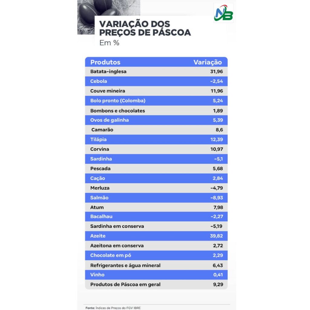 A cesta de produtos típicos de Páscoa subiu 9,29% entre março de 2023 e fevereiro de 2024, segundo levantamento do FGV Ibre (Instituto Brasileiro de Economia da Fundação Getulio Vargas).