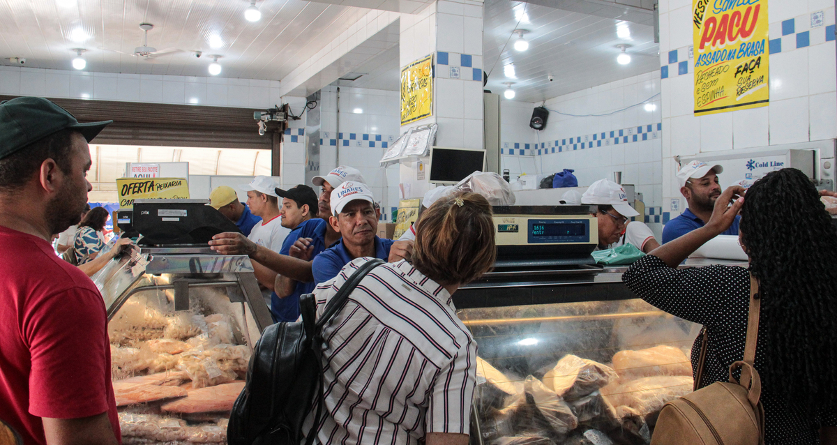 Consumidores deixam para comprar peixe, prato principal do almoço de amanhã, na véspera da Sexta-Seira Santa de última hora e lotam peixaria na Capital. No Mercadão municipal o fluxo de clientes é grande, há mais de 300 pessoas dentro do comércio e fora do comércio em busca de peixes.