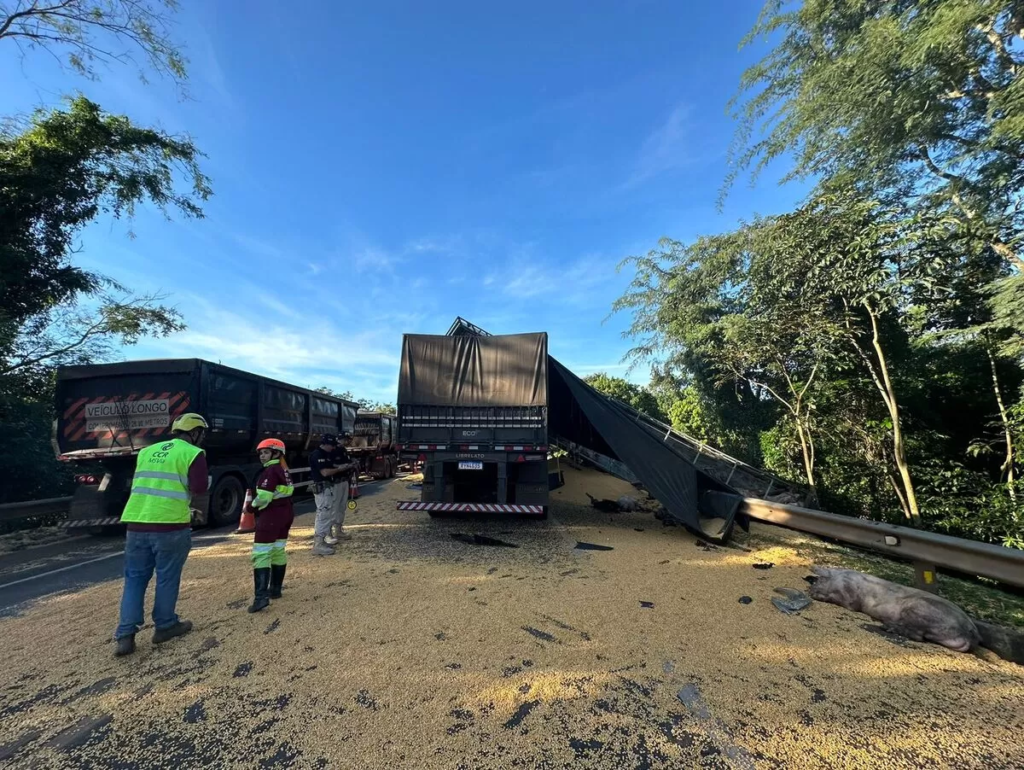 Além das duas carretas carregadas, um caminhão pequeno e um veículo de passeio (Onix) também se envolveram no acidente, sendo que as apurações iniciais não conseguiram definir o total de vítimas.