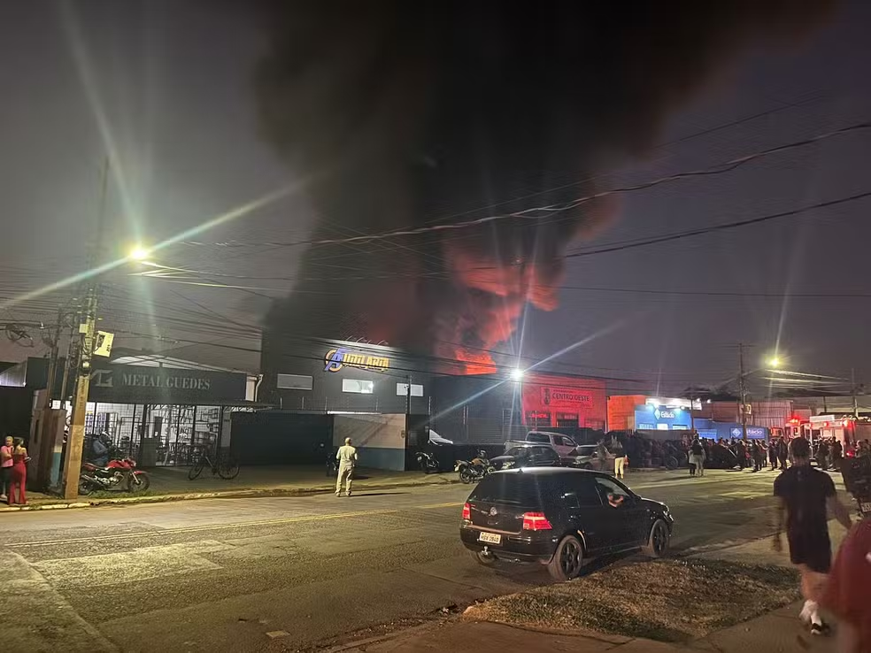 Em vídeo que circula na internet, é possível ver a densa fumaça preta sobre a estrutura da borracharia. Moradores da região temem que as chamas se espalhem para comércios vizinhos.