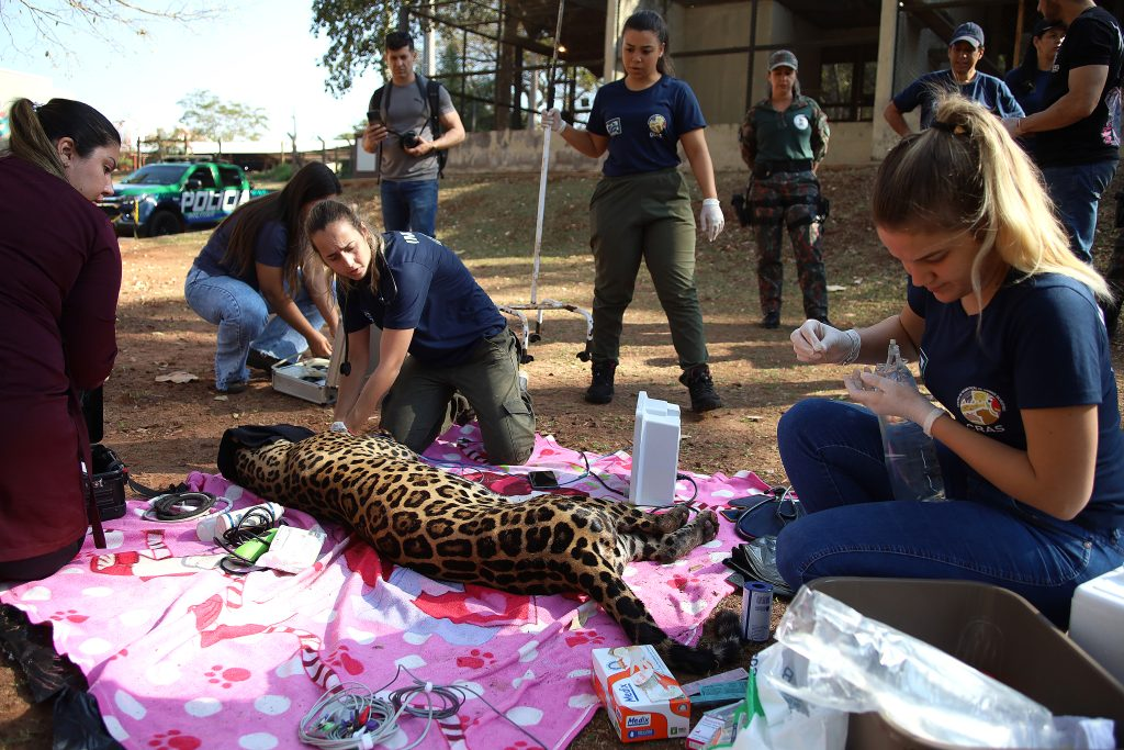 Já no Ayty – nome em tupi-guarani que significa cuidado e acolhimento, simbolizando o carinho que os animais ali recebem – a onça-pintada recebeu de pronto o tratamento com pomadas especiais para queimaduras e com ozônio, que acelera a cicatrização. Neste sábado ela foi sedada para os exames ao ar livre, uma forma de garantir a temperatura corporal do animal com a luz solar. Além disso, Miranda foi pesada e está com 60 kg – a fêmea tem cerca de dois anos.