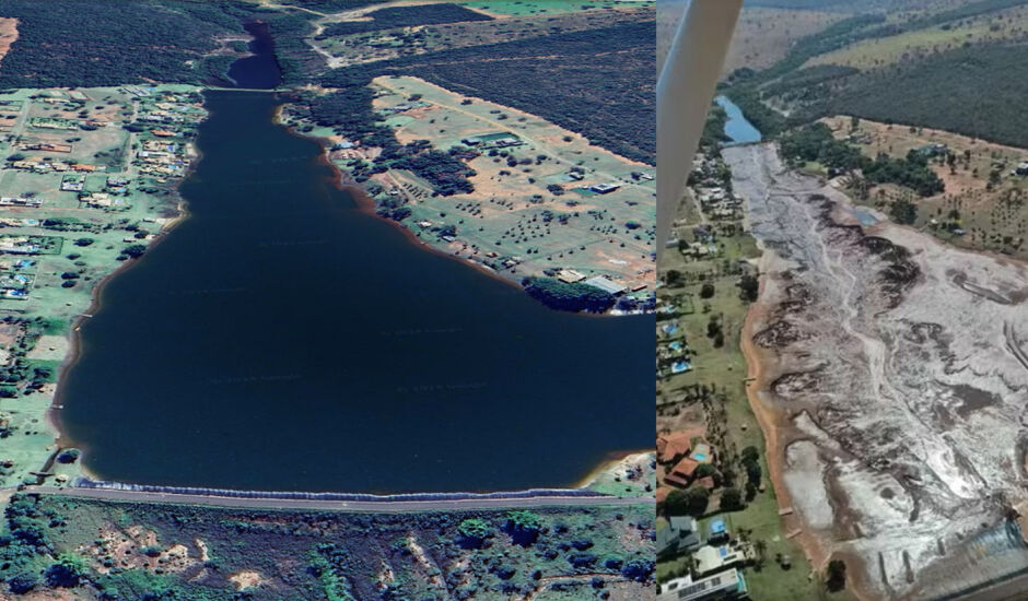 Imagem feitas de um avião mostra o antes e depois de represa se romper no condomínio de luxo Nasa Park, entre os município de Jaraguari e Campo Grande, na manhã desta terça-feira (20). A água invadiu casas e parte da BR-163. A rodovia está totalmente interditada, próximo ao km 500.