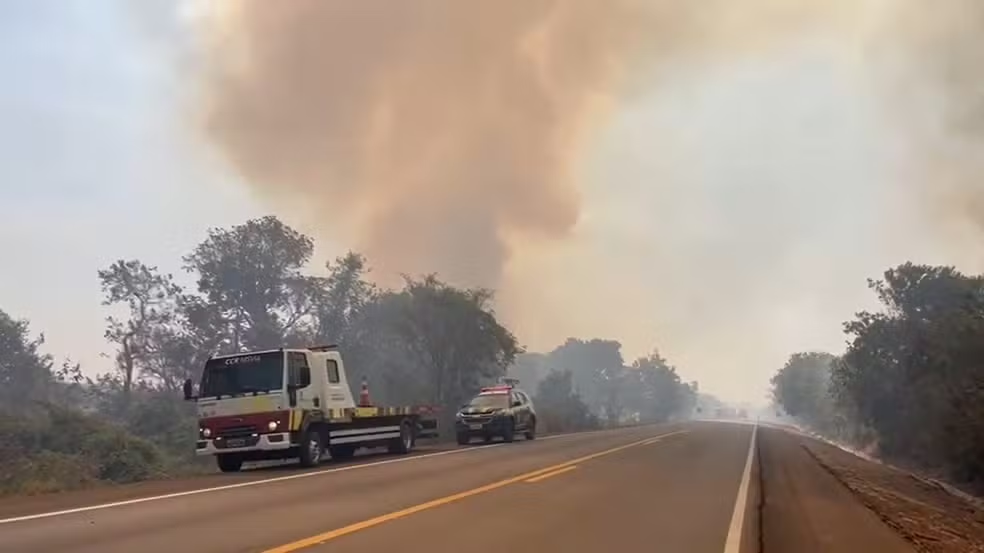 Equipes da Polícia Rodoviária Federal (PRF), Corpo de Bombeiros e da CCR-MS Vias, concessionária responsável pela rodovia no estado, tentam conter as chamas.