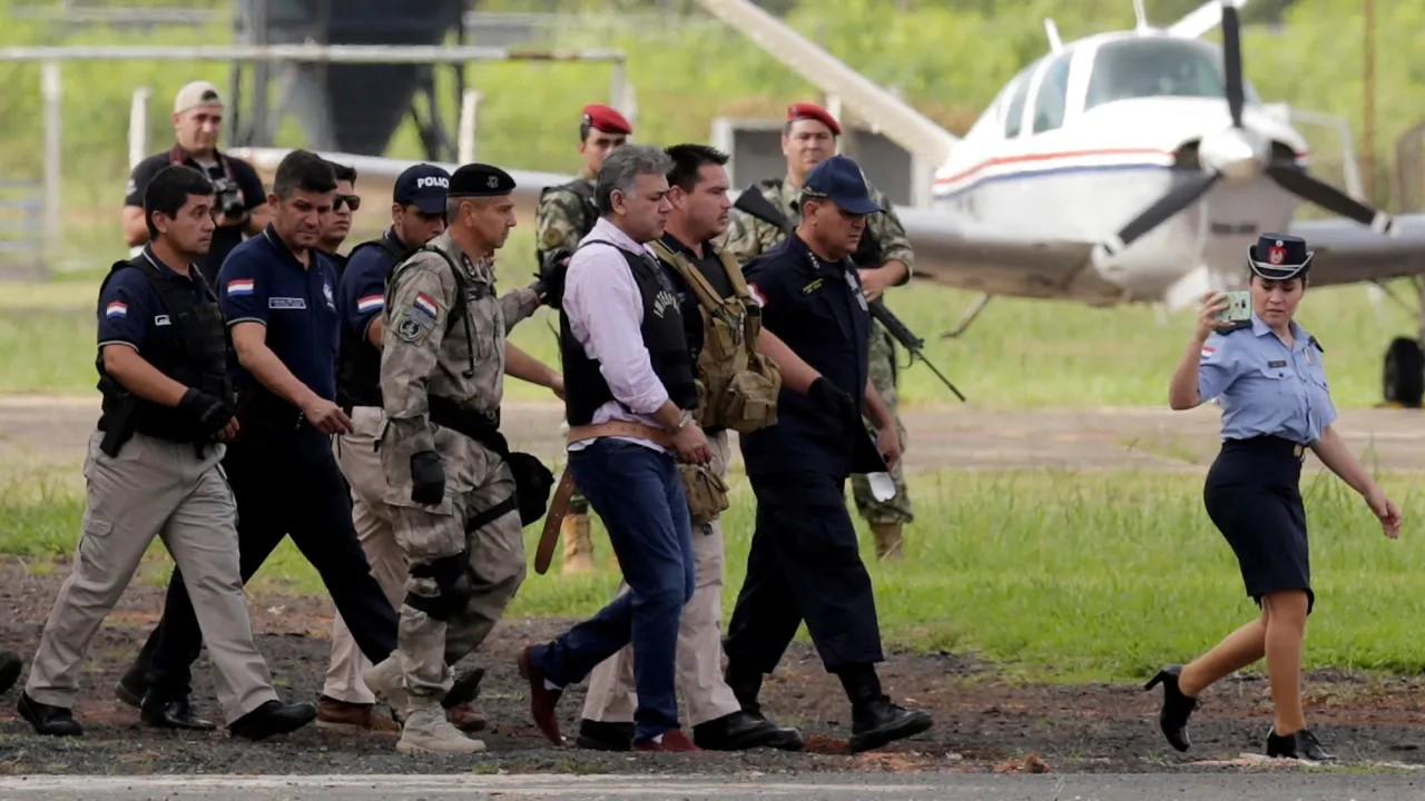 Jarvis Pavão é acompanhado por forças de segurança enquanto é extraditado para o Brasil, em 2017.