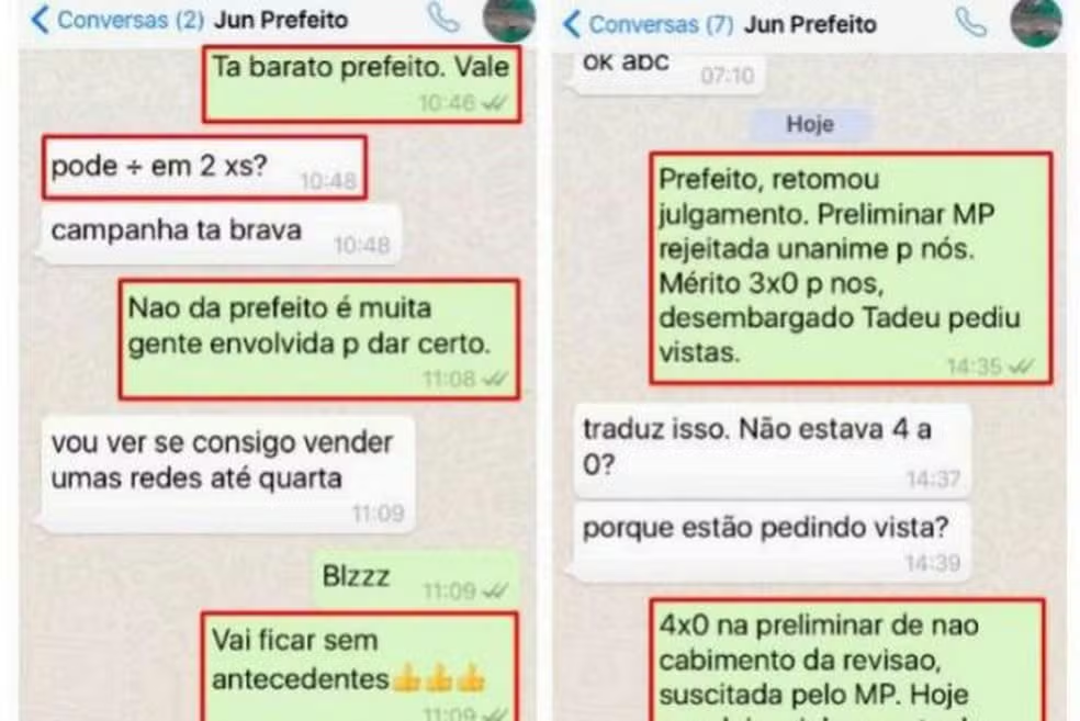 Na troca de mensagens o advogado diz para seu cliente: “Ta barato prefeito. Vale”, momento em que o cliente pede para parcelar o pagamento em duas vezes. O advogado complementa, comentando que “…é muita gente envolvida para dar certo” e reforça a argumentação dizendo que o cliente “vai ficar sem antecedentes”.