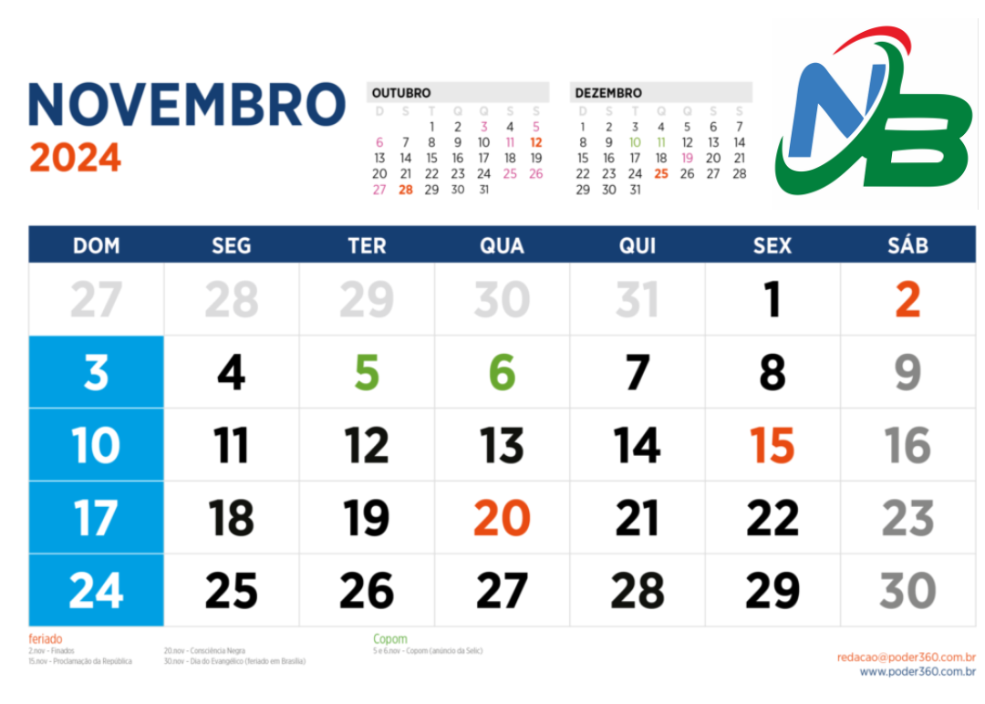 O penúltimo mês do ano terá três feriados nacionais: 2 de novembro: Finados (sábado); 15 de novembro: Proclamação da República (sexta-feira); 20 de novembro: Consciência Negra (quarta-feira).