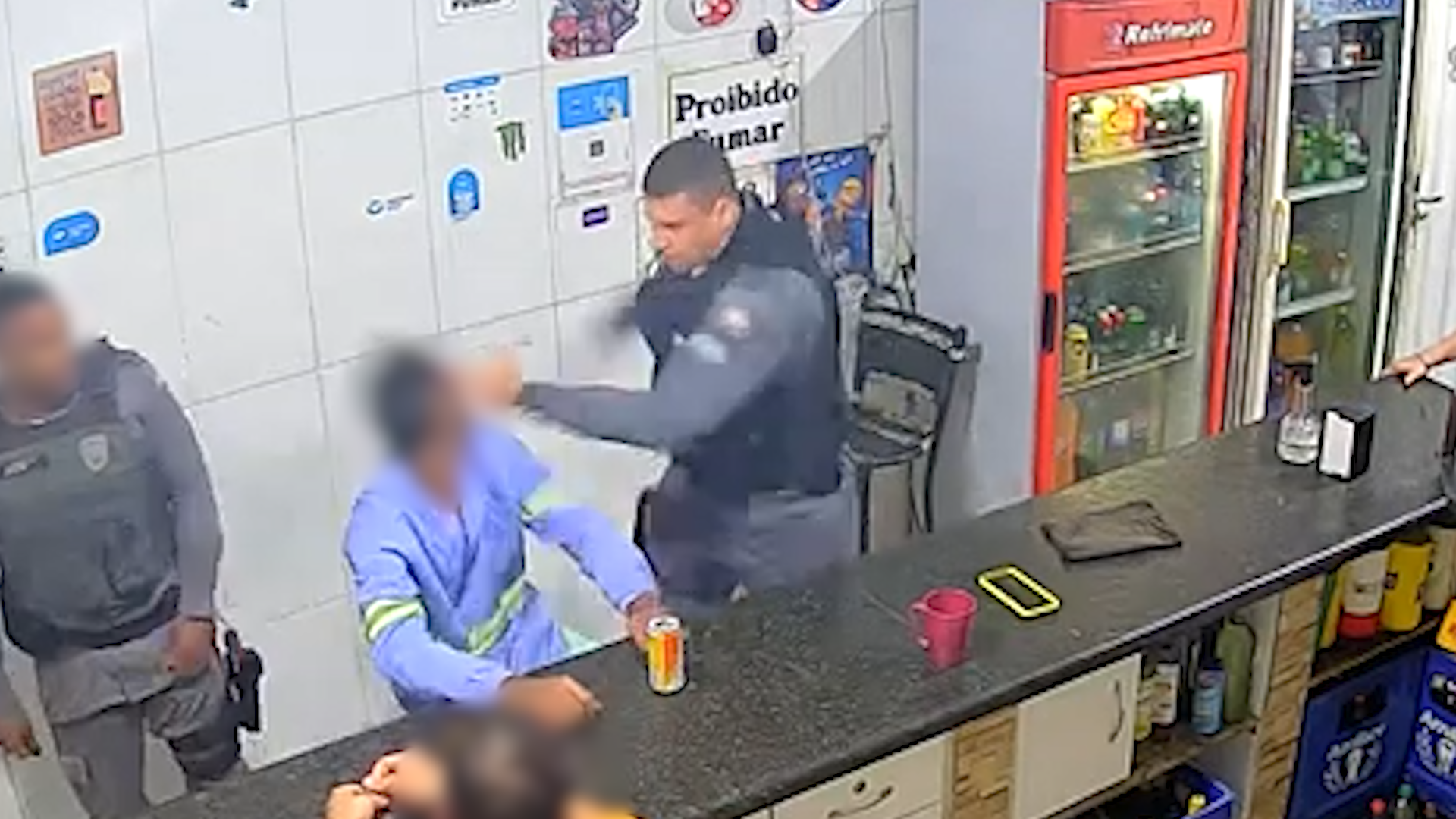 Nas imagens é possível ver dois policiais descendo de uma viatura e entrando em um bar onde cinco pessoas estão presentes. Assim que chegam, os policiais saúdam as pessoas cordialmente e, sem seguida, estapeiam um homem que está sentado sozinho bebendo.