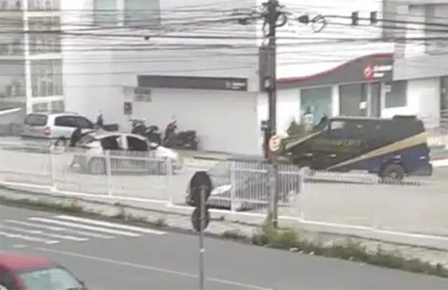 Ainda não se sabe se os suspeitos roubaram dinheiro, mas houve troca de tiros. Na fuga, o motorista do carro-forte bloqueou a saída, prensando o carro dos criminosos contra uma parede.