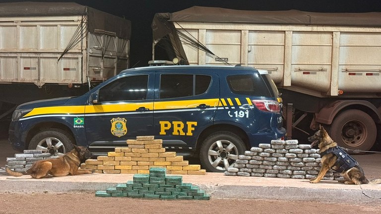 Em vistoria na carreta, os agentes da PRF contaram com o trabalho dos cães farejadores K9 Zorro, Amélia e Thor, que indicaram a presença de ilícitos.