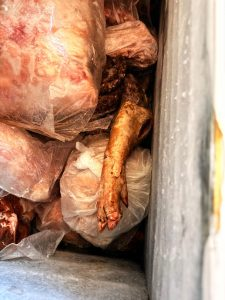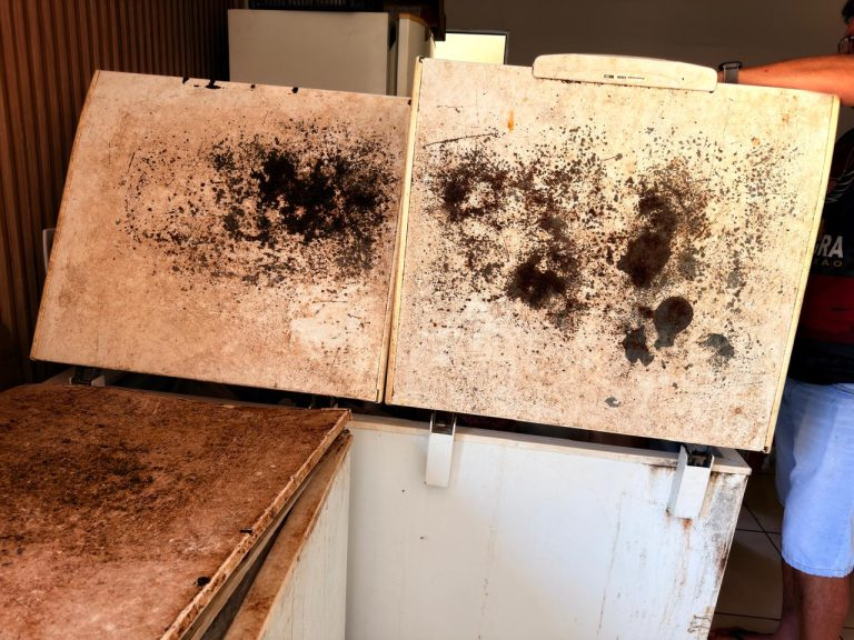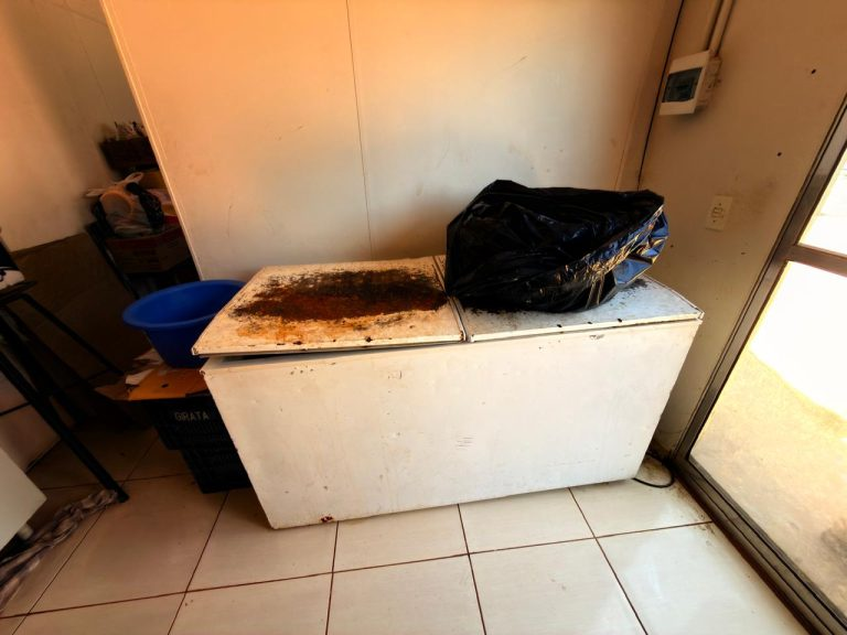 Também foram localizadas duas unidades de língua bovina, indicando possível abate clandestino. Ao todo, 82,05 kg de produtos impróprios para consumo foram apreendidos e descartados, entre carnes bovina, suína, de carneiro, massa para linguiça e frango.
