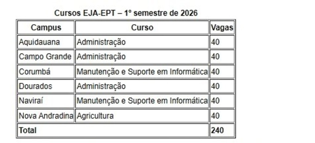 Ao todo, são 360 vagas distribuídas entre cursos técnicos integrados ao ensino médio, na modalidade Educação de Jovens e Adultos (EJA EPT), e cursos técnicos subsequentes ao ensino médio. Os editais Edital nº 80/2025 e nº 81/2025, que reúnem todas as informações sobre regras, cronograma e etapas do processo seletivo, estão disponíveis na Central de Seleção do IFMS.