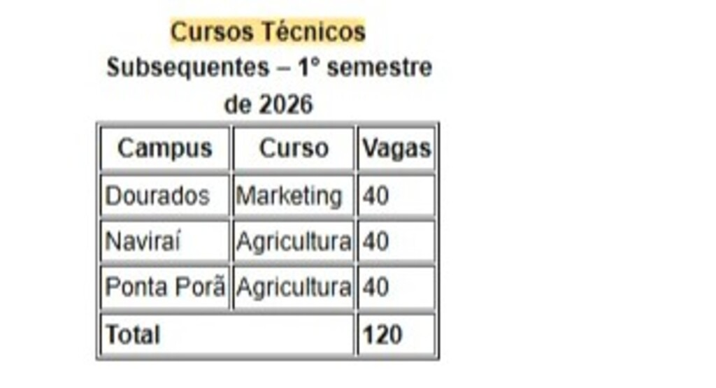 De acordo com o IFMS, os estudantes selecionados cursarão simultaneamente o ensino médio e a formação técnica, com aulas presenciais no período noturno. São 240 vagas distribuídas entre sete campi da instituição. Cursos técnicos subsequentes ao ensino médio — Edital nº 81/2025. Os cursos subsequentes são voltados a quem já concluiu o ensino médio. As aulas, também presenciais, serão realizadas no período noturno. Neste edital, são oferecidas 120 vagas em três campi do IFMS.