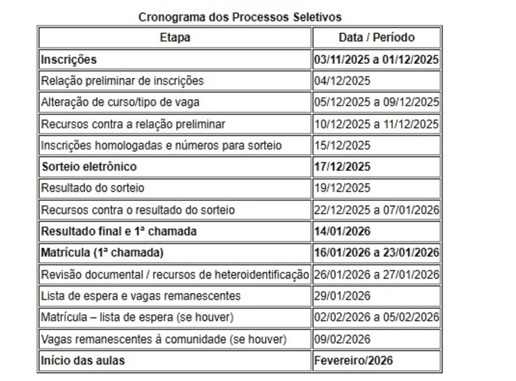 A seleção será feita por sorteio eletrônico, marcado para 17 de dezembro. Se o número de inscritos for menor que o total de vagas, não haverá sorteio, e todos os candidatos com inscrição homologada serão convocados para matrícula. O resultado final está previsto para 14 de janeiro, e o início das aulas ocorrerá em fevereiro de 2026.