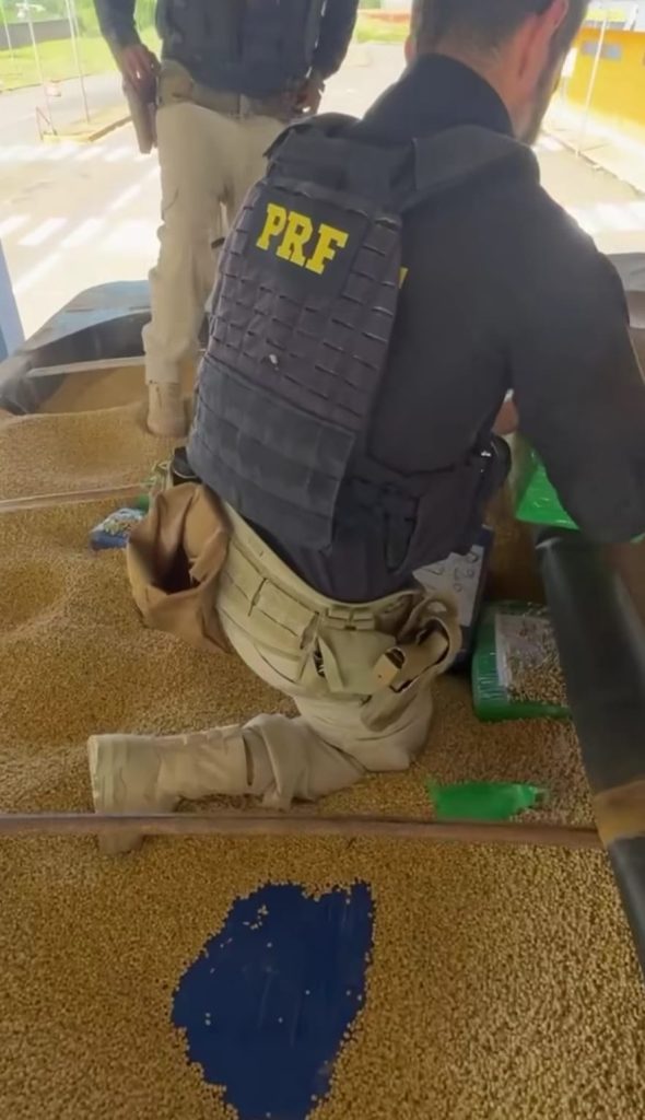 O condutor, informou que a carreta havia quebrado e a mudança de data se deu depois do ocorrido. Durante a vistoria, os policiais localizaram em meio a carga alguns fardos camuflados ao grãos de soja. A inspeção avançou e os PRF encontrou diversos fardos de maconha e a conhecida super maconha colômbia Gold.