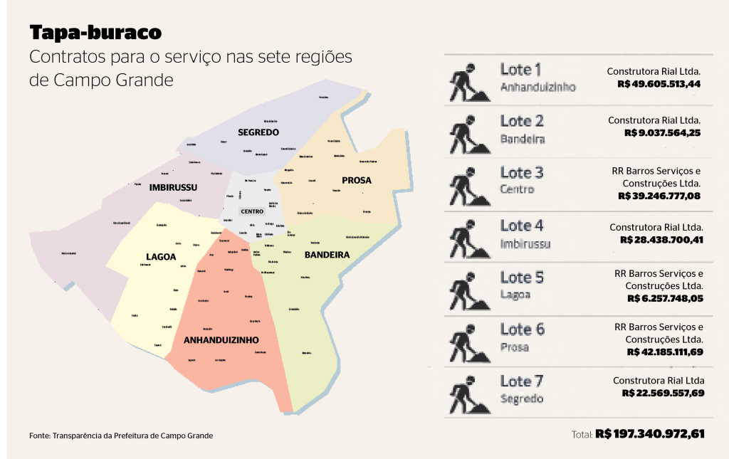 De acordo com o portal de Transparência da Prefeitura de Campo Grande, existem sete contratos ativos que realizam o tapa-buraco, cada um responsável por uma região da cidade (Anhanduizinho, Bandeira, Centro, Imbirussu, Lagoa, Prosa e Segredo).
